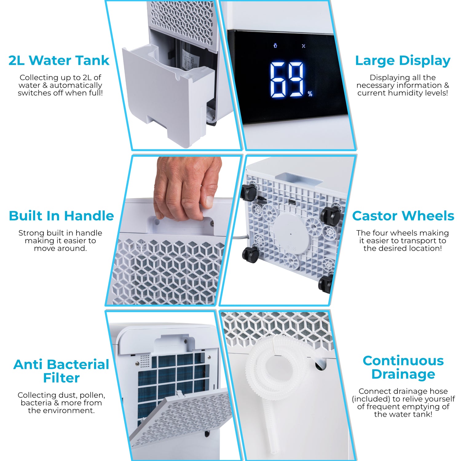 - OTHER FEATURES - The unit features a built in 2 litre water tank which will automatically shut itself off when the tank is full. Alternatively, you can use the included drain pipe for continuous operation. The compact & portable dehumidifier also comes with casters and a built-in handle, allowing for easier mobility throughout your home.