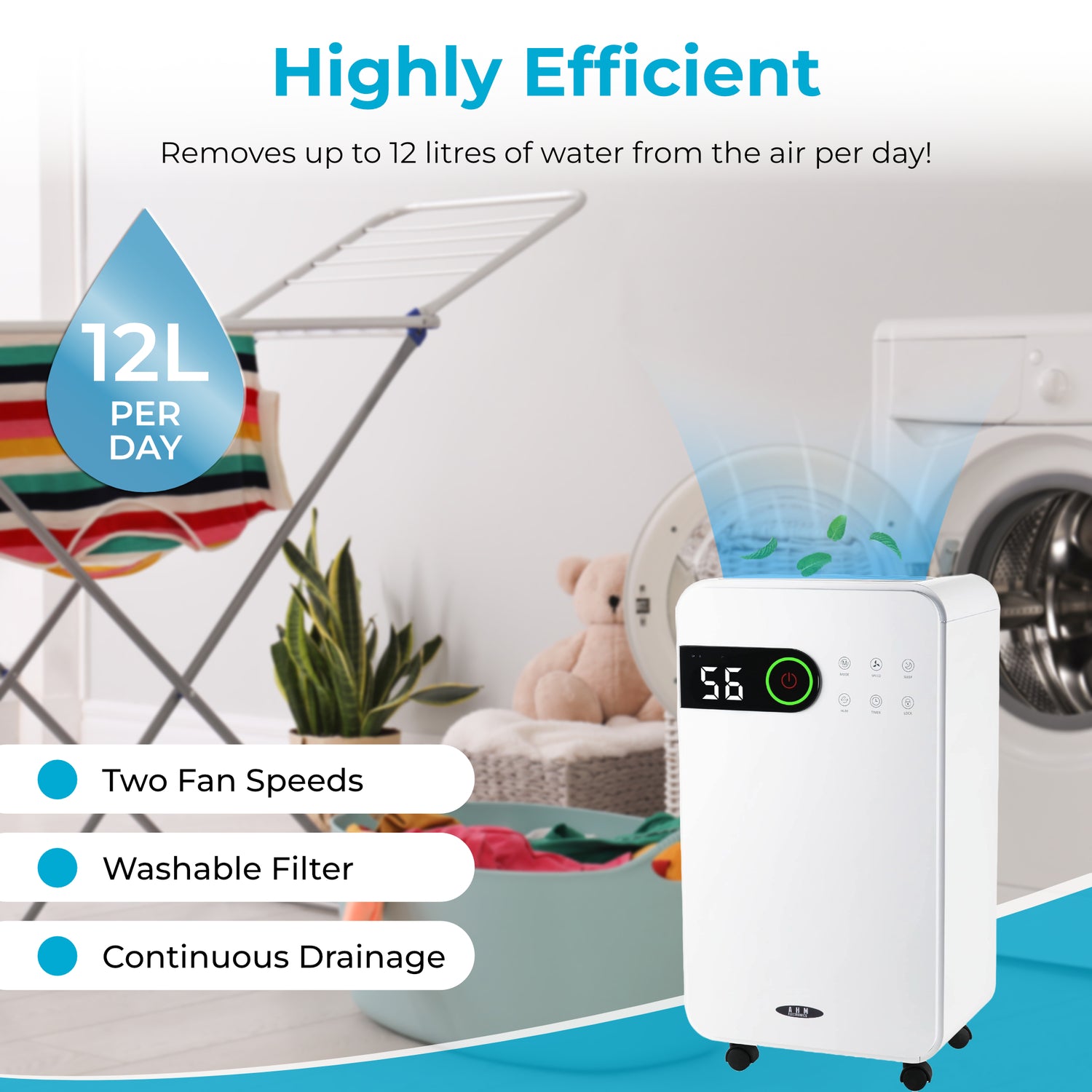 - 12L DEHUMIDIFIER - The AHM Electronics portable compressor dehumidifier removes up to 12 litres of water from the air per day. It is an energy efficient and cost effective method of maintaining a healthy environment in your home - suitable for daily use. Easily monitor ambient humidity levels through the digital LED display.